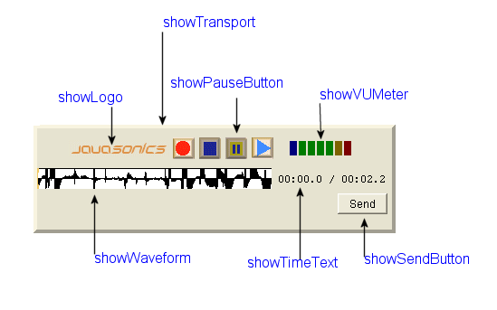 Turning On and Off GUI ElementsYou can customize ListenUp Applets by showing, or not showing, parts of the user interface. This is controlled using Applet parameters inside the <applet> tag. Select a name from the diagram below then set the value to "yes" or "no". For example:<param name="showLogo" value="no" /> |